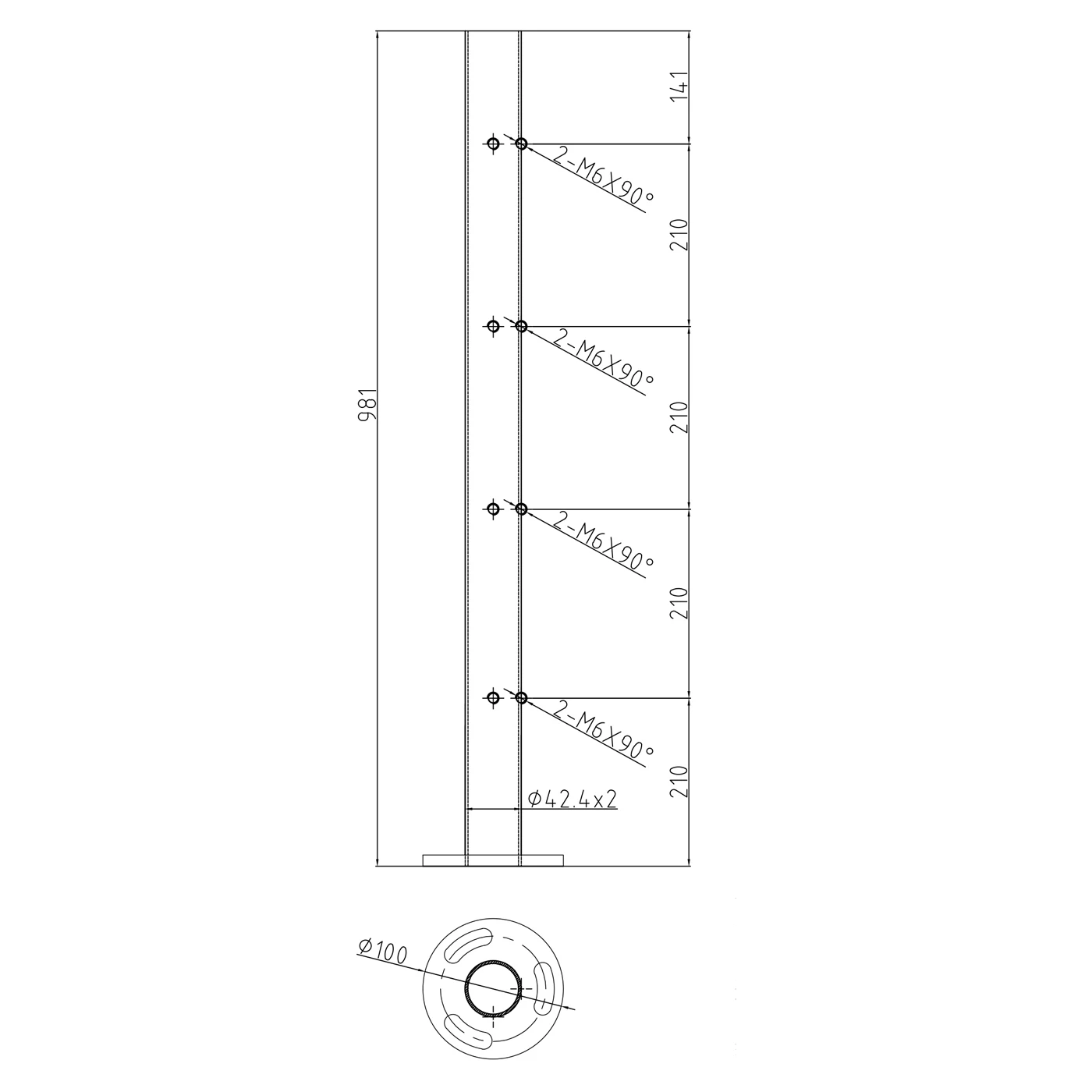- Auf jeder Ebene: 2 Löcher M6 im 90°-Winkel angeordnet