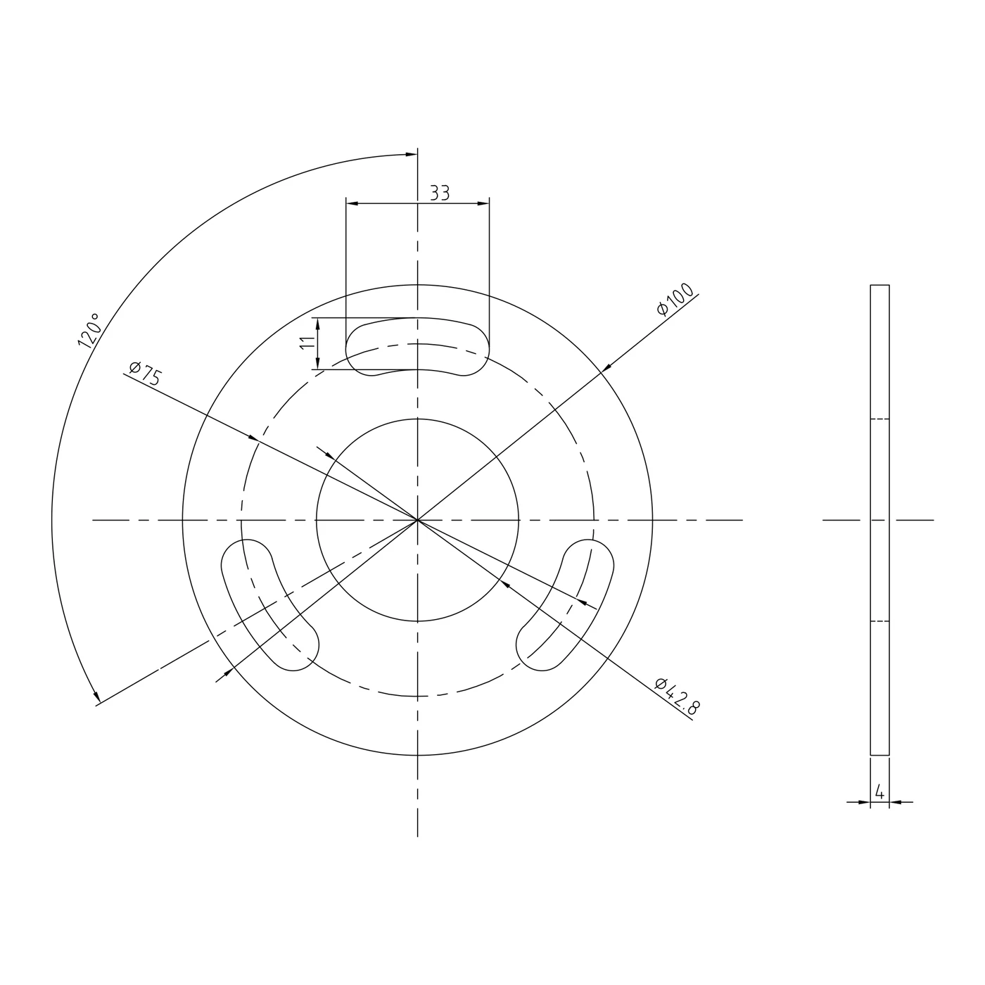 - Teilungswinkel zwischen den Löchern: 120° (3 Montagelöcher)