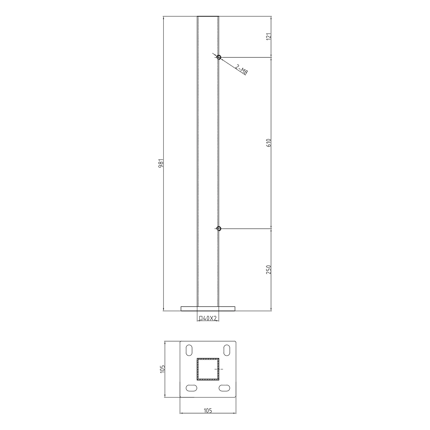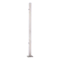Der Pfosten wird direkt am Boden mittels angeschweißter Platte mit den Abmessungen 105×105 mm mit vier Langlöchern montiert. Die ovale Form der Löcher (20×11 mm) ermöglicht eine Korrektur der Ausrichtung während der Montage. Zwei Löcher mit Gewinde M8, die am Pfosten im Abstand von 610 mm angeordnet sind, ermöglichen eine schnelle Befestigung von Geländerquerstreben ohne die Notwendigkeit von Bohren oder Gewindeschneiden auf der Baustelle.