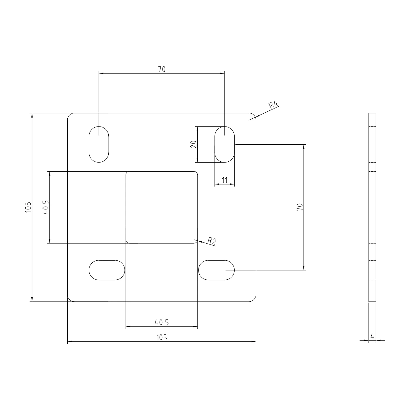 - Montagelöcher in der Grundplatte: oval (Langlöcher) 20×11 mm, Achsabstand 70×70 mm