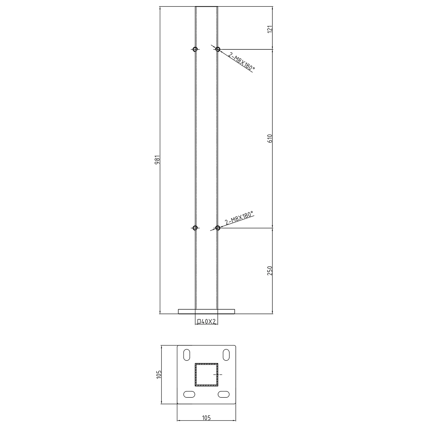Mittiger Geländerpfosten PINOX aus Quadratprofil 40×40 mm mit einer Höhe von 981 mm — fertiges Konstruktionselement für den Bau von Geländern im System 40×40. Gefertigt aus Edelstahl AISI 304 mit satinierter Oberflächenausführung, verbindet er hohe Korrosionsbeständigkeit mit moderner Ästhetik. Vier Gewindebohrungen M8 auf zwei Ebenen angeordnet ermöglichen eine schnelle Montage von Handlaufhaltern ohne die Notwendigkeit zu bohren und zu gewindeschneiden auf der Baustelle.