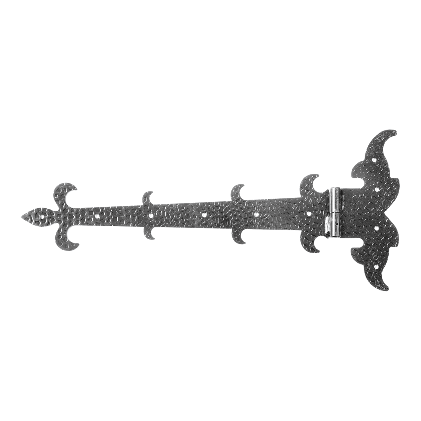 Die Ausführung aus Stahl gewährleistet hohe mechanische Festigkeit und Langlebigkeit. Die dekorativen Elemente – das Lilienmotiv am Ende des Arms sowie die ziervollen Biegungen – machen dieses Scharnier zur perfekten Wahl für Tore und Gartentüren im rustikalen, ländlichen oder historisierenden Stil.