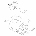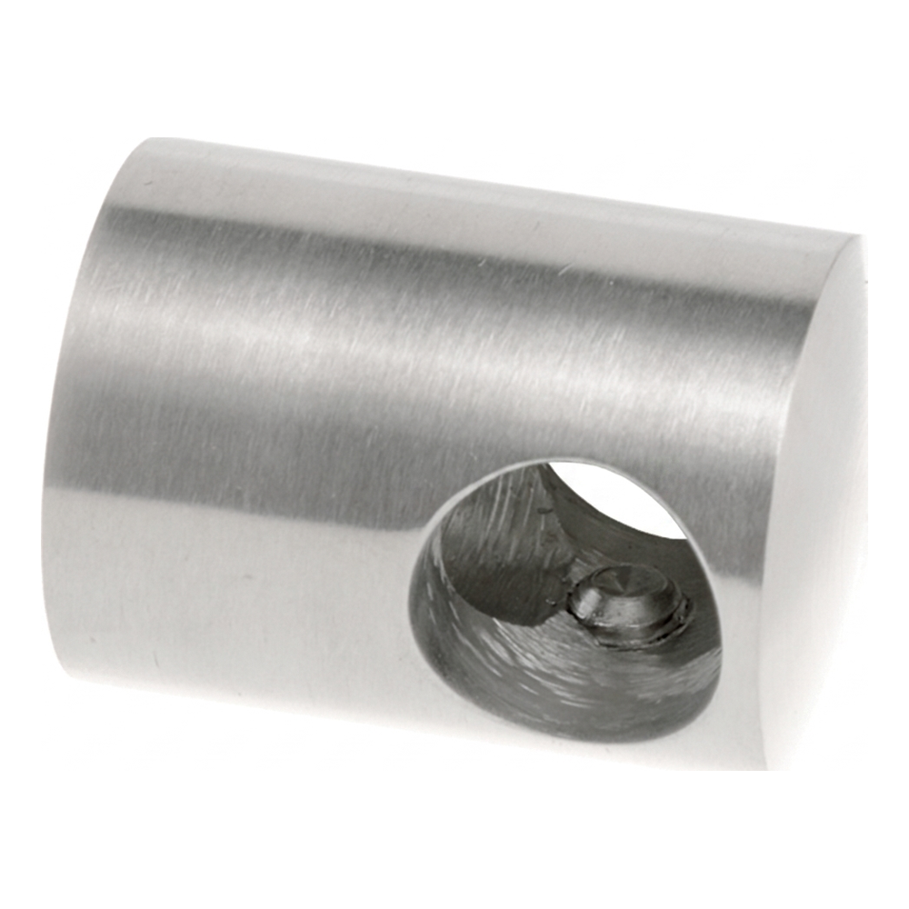 Die Befestigung hat die Form eines zylindrischen Körpers mit einer Durchgangsbohrung, durch die der Stab oder das Rohr verläuft. Die Befestigung an der Fläche erfolgt von unten mittels einer Montagebohrung. Zwei seitliche Klemmschrauben ermöglichen eine sichere Blockierung des Stabes innerhalb der Befestigung. Dank kompakter Abmessungen fügt sich das Element diskret in das moderne Design von Edelstahlgeländern ein.