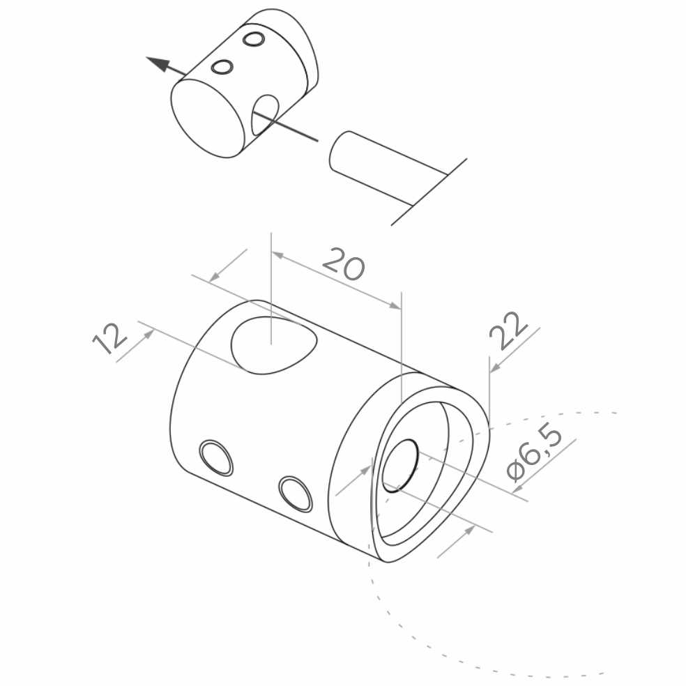 Die kompakte, zylindrische Form mit präzise gefrästem Durchgangsloch erleichtert die Montage und sorgt für ein ästhetisches, minimalistisches Aussehen. Die innere Klemmschraube ermöglicht eine sichere Befestigung des Stabs ohne Schweißen.