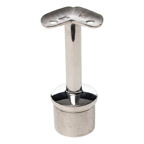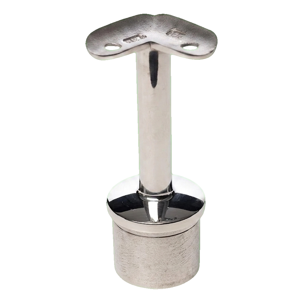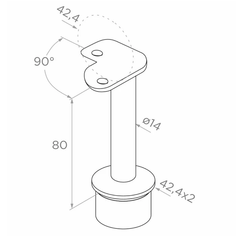 Die Halterung ist aus Edelstahl AISI 304 in polierter Ausführung (Hochglanz) gefertigt, was hohe Korrosionsbeständigkeit und elegantes Aussehen garantiert. Die Konstruktion besteht aus einer zylindrischen Basis, die an das Pfosten rohr 42,4×2 mm angepasst ist, einem Zapfen mit Durchmesser Ø14 mm sowie einem Montageblech mit zwei Bohrungen, auf dem der Handlauf mit Durchmesser 42,4 mm aufliegt. Die Höhe vom Pfosten zum Handlauf nach der Montage beträgt 80 mm.