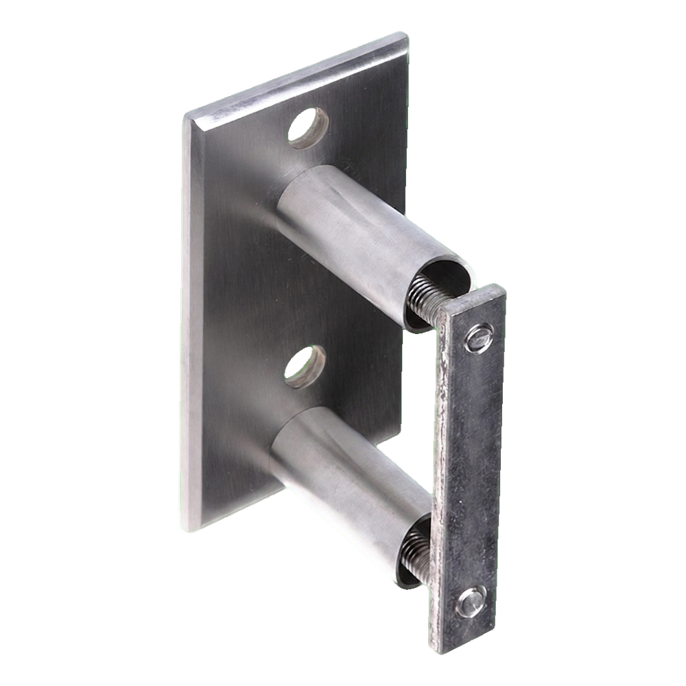 Die Befestigung ist für die Wandmontage vorgesehen – die rechteckige Platte mit Montagelöchern wird direkt an die Wand geschraubt, und zwei zylindrische Abstandshalter gewährleisten einen Abstand des Pfostens von der Oberfläche um 50 mm. Die Konstruktion ermöglicht eine schnelle und sichere Montage sowohl an gemauerten als auch an Betonwänden. In der Verpackung befindet sich 1 Stück Befestigung.
