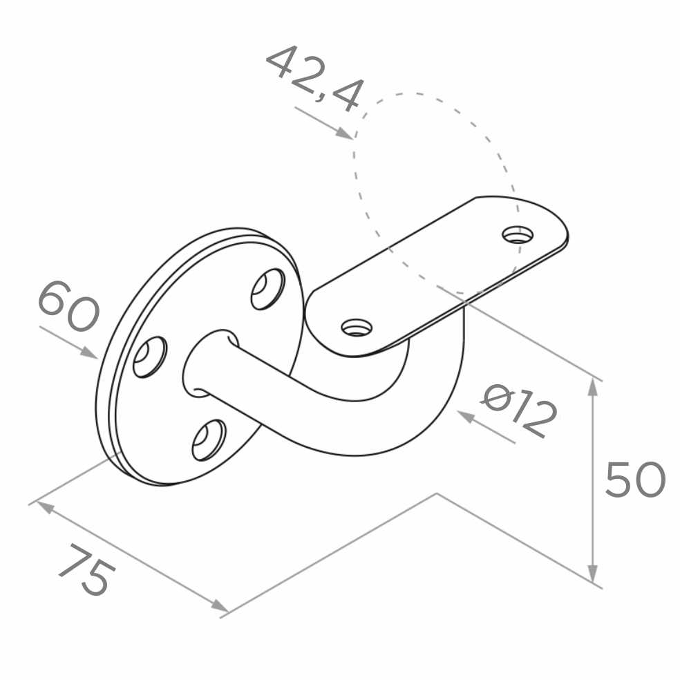 Das obere Blech mit Montagelöchern bildet eine stabile Stütze für den Handlauf, und der profilierte Arm mit Durchmesser ø12 mm garantiert Steifigkeit und sichere Befestigung. Die polierte Oberfläche des Edelstahls ist äußerst pflegeleicht — die meisten Verschmutzungen entfernen Sie mit einem trockenen, weichen Mikrofasertuch, und fettige Flecken mit einem speziellen Edelstahlreiniger.