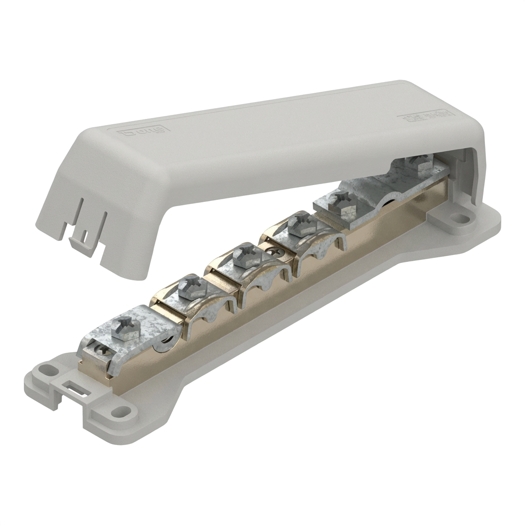 Potentialausgleichsschiene für den Potentialausgleich in Blitzschutz- und Erdungsanlagen. Die kompakte Bauweise mit Schutzabdeckung ermöglicht den sicheren Anschluss mehrerer Leiter an einem einzigen Verbindungspunkt.