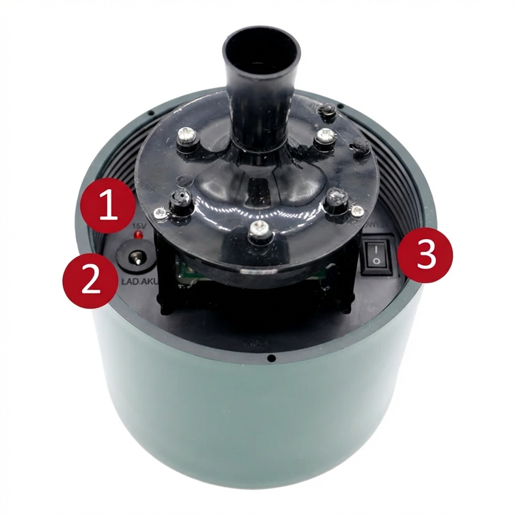 Auf dem obigen Foto sind die wichtigsten Bedienelemente zu sehen: 1 – LED-Signalleuchte, 2 – ŁAD.AKU-Buchse zum Anschluss des Ladegeräts, 3 – POWER-Schalter (I/O).