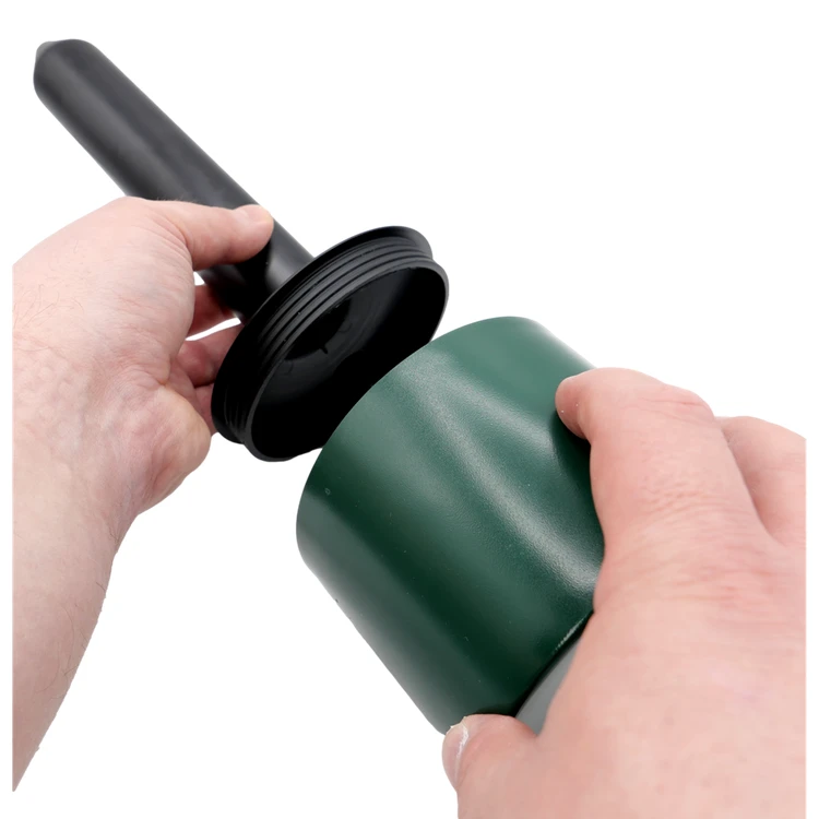 Einfache Montage in wenigen Schritten. Es genügt, das Kopfteil abzuschrauben, das Gerät mit dem POWER-Schalter einzuschalten, das Kopfteil wieder aufzuschrauben und dann den Spieß vorsichtig in den Boden zu drehen. Bei der Erstinstallation empfiehlt es sich, mit einem Stock oder Stab ein senkrechtes Loch in einen Maulwurfshügel zu bohren. Nach der Montage sollte das Kopfteil ca. 5 cm über die Bodenoberfläche hinausragen. Das Gerät arbeitet ununterbrochen bis zum Ausschalten oder bis der Akku entladen ist.