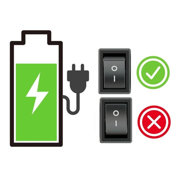 Die Kontrolle des Ladezustands ist ebenso einfach. Die LED-Anzeige signalisiert den Akkustand: ein 1-Sekunden-Blinken alle 10 Sekunden bedeutet ca. 30% Energie, ein kurzes Blinken (~100 ms) alle 5 Sekunden – unter 10%. Nach dem Anschließen des Ladegeräts leuchtet die LED dauerhaft, nach Abschluss des Ladevorgangs erlischt sie. Achtung: Das Laden erfolgt nur bei eingeschaltetem Schalter (Position "I").