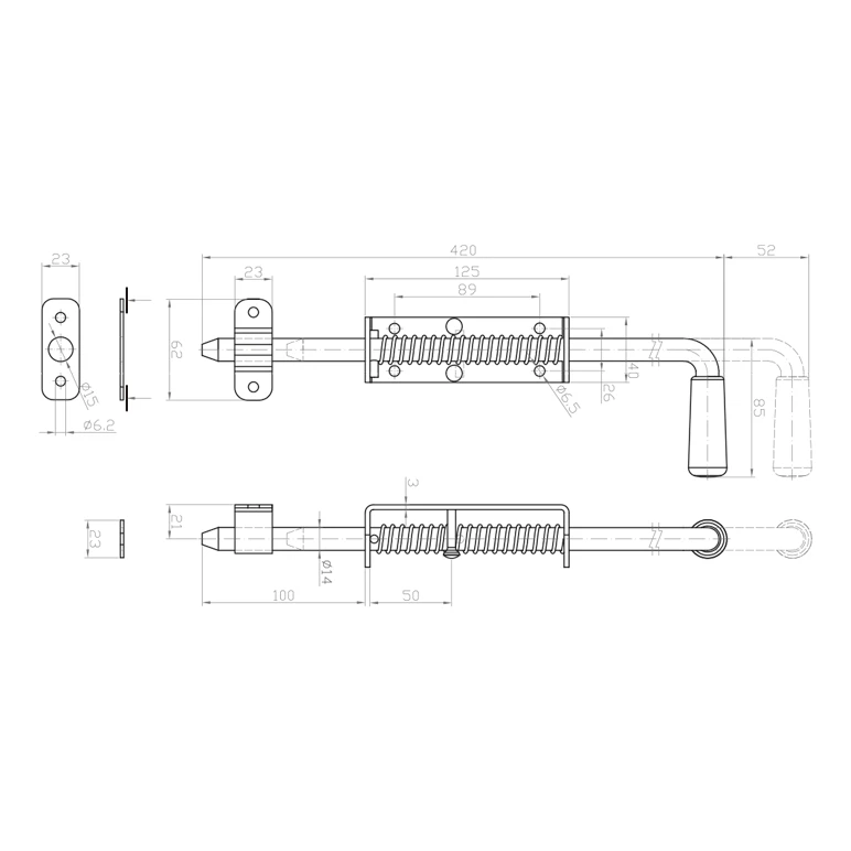 Die technische Zeichnung zeigt die vollständige Geometrie des Riegels mit allen Maßangaben. Dank der einfachen Konstruktion und der standardisierten Befestigungspunkte eignet sich das Produkt sowohl für neue Zauninstallationen als auch für die Modernisierung bestehender Tore. Der Federmechanismus hält den Bolzen selbsttätig in der Verriegelungsposition und verhindert so ein unbeabsichtigtes Öffnen des Tores durch Wind oder Vibrationen.