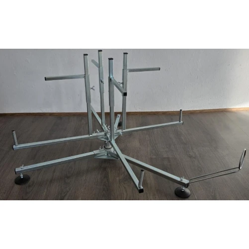 Die Konstruktion besteht aus hochwertigen verzinkten Stahlprofilen, was eine jahrelange Haltbarkeit auch bei intensivem Einsatz auf Baustellen garantiert. Der stabile Sternfuß mit verstellbaren Stellfüßen sorgt für sicheren Stand auf jedem Untergrund.