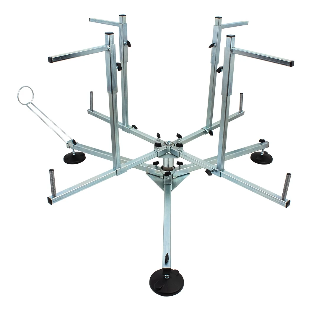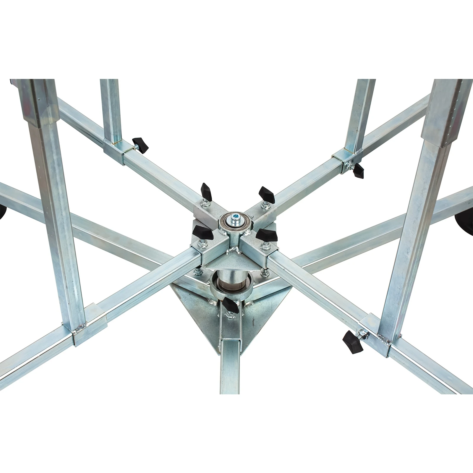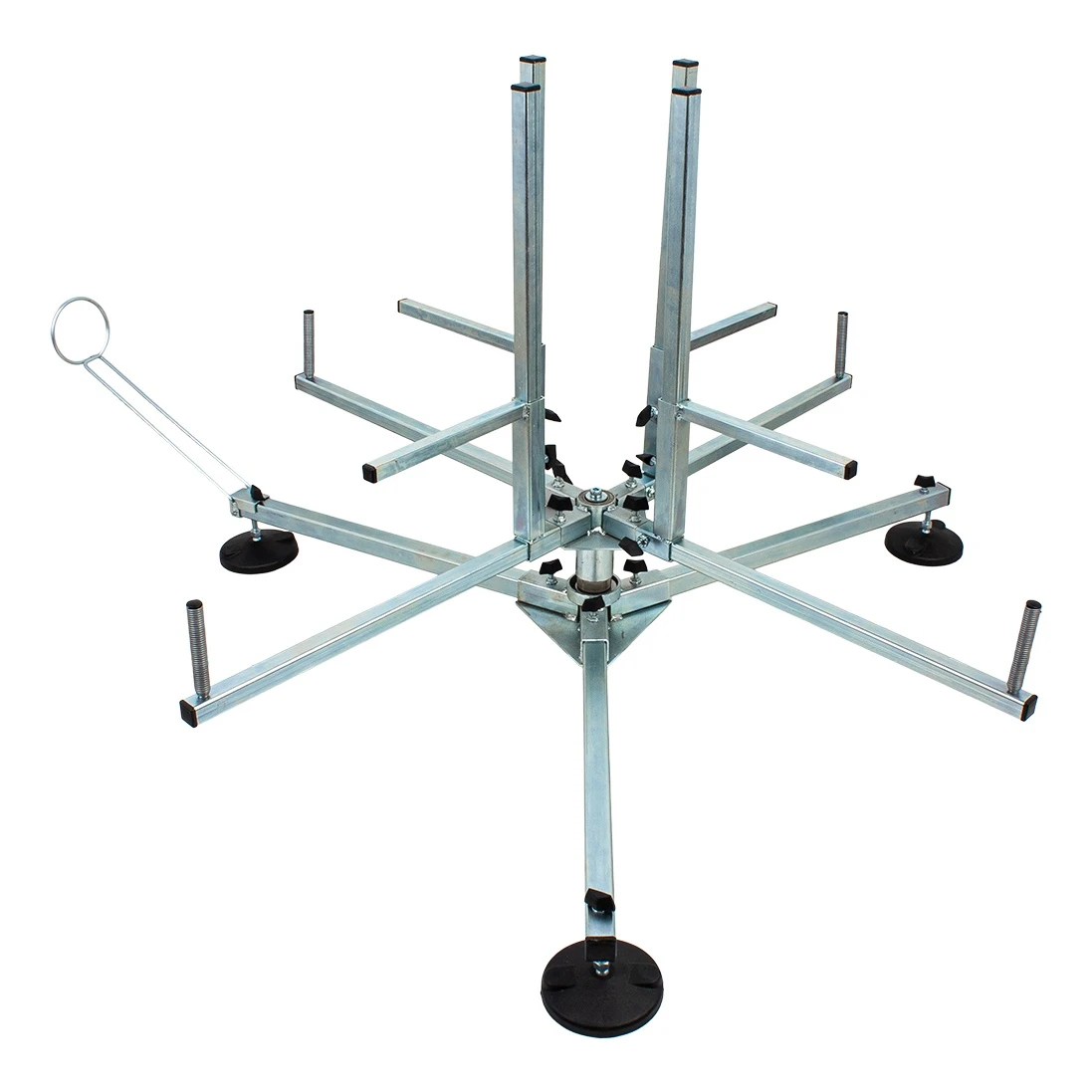 Die Konstruktion besteht aus hochwertigen verzinkten Stahlprofilen, was eine jahrelange Langlebigkeit selbst bei intensivem Einsatz auf Baustellen garantiert. Die stabile Sternbasis mit verstellbaren Füßen sorgt für sicheren Stand auf jedem Untergrund.