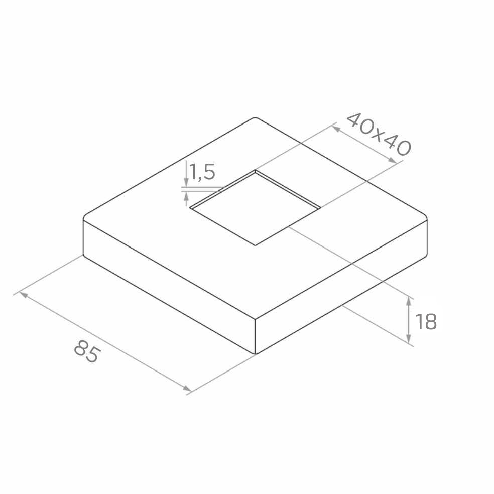 Quadratische Abdeckrosette 85×85 mm aus Edelstahl AISI 304 mit satiniertem Finish — ästhetisches Abdeckelement zum Verdecken von Montagelöchern in Edelstahl-Geländern mit 40×40 mm Profil. Durch präzises Tiefziehen und satinierte Oberfläche fügt sich die Rosette ideal in die Geländerkonstruktion ein und verleiht ihr ein professionelles, durchdachtes Finish.