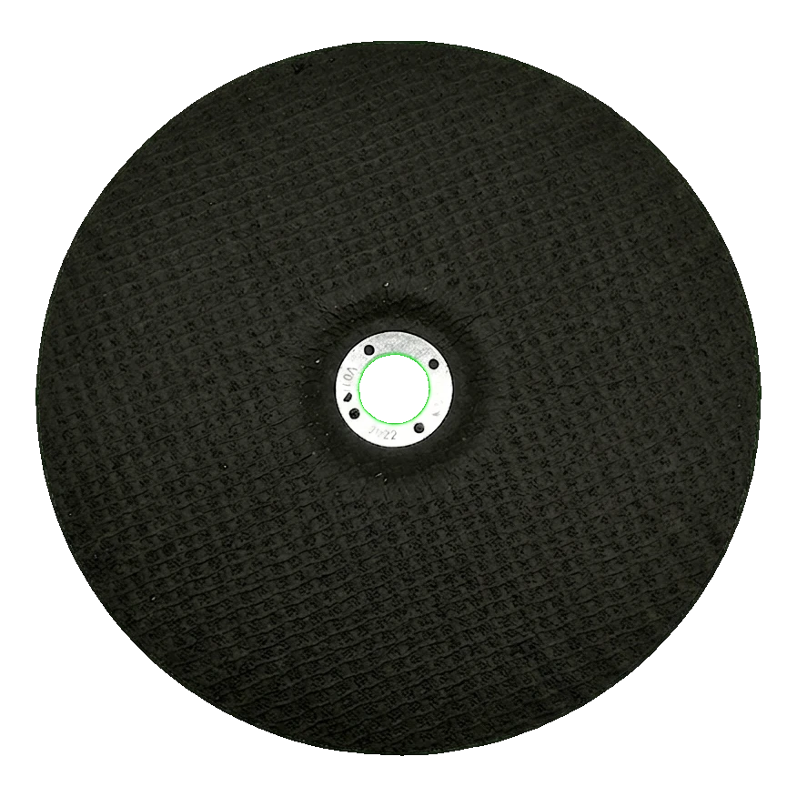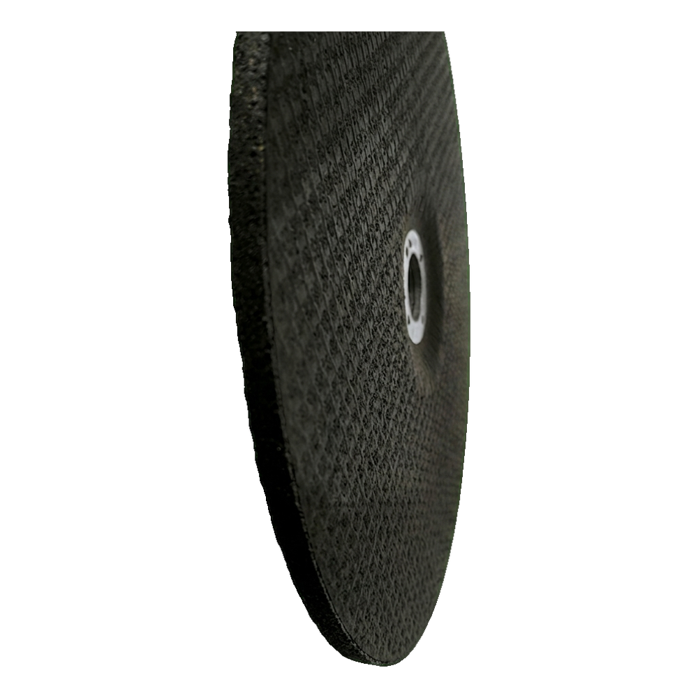 Die Scheibe besitzt ein konkaves Zentralprofil (Typ 27), wodurch die Arbeitsfläche nicht mit der Befestigungsmutter des Winkelschleifers kollidiert. Das von der Rückseite sichtbare Verstärkungsgewebe aus Glasfaser verstärkt die Schleifstruktur und schützt vor Zerfall der Scheibe bei Arbeitsdrehzahlen.
