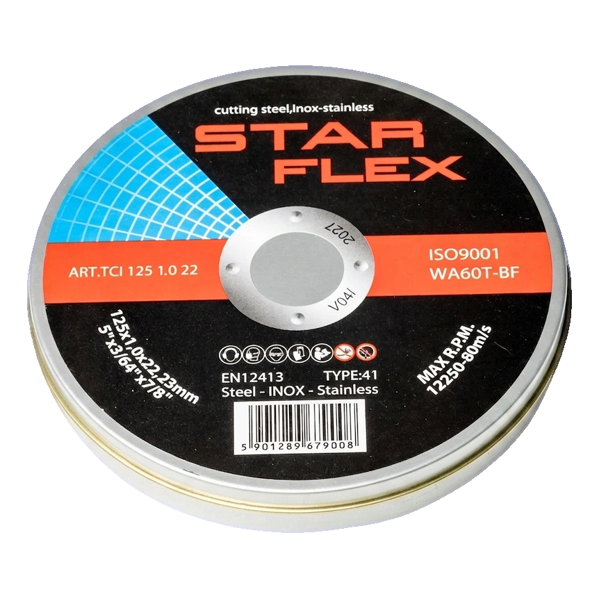 Die Bezeichnung WA60T-BF auf den Starflex Scheiben weist auf weißes Korundschleifmittel (WA) mit Körnung 60, Härte T (sehr hart) und faserverstärkter Kunstharzbindung (BF) hin. Diese Kombination gewährleistet optimale Balance zwischen Schneidagressivität und Scheibenlebensdauer — auch bei intensiver Nutzung auf Edelstahl, der hohe Temperaturen in der Schneidzone erzeugt.
