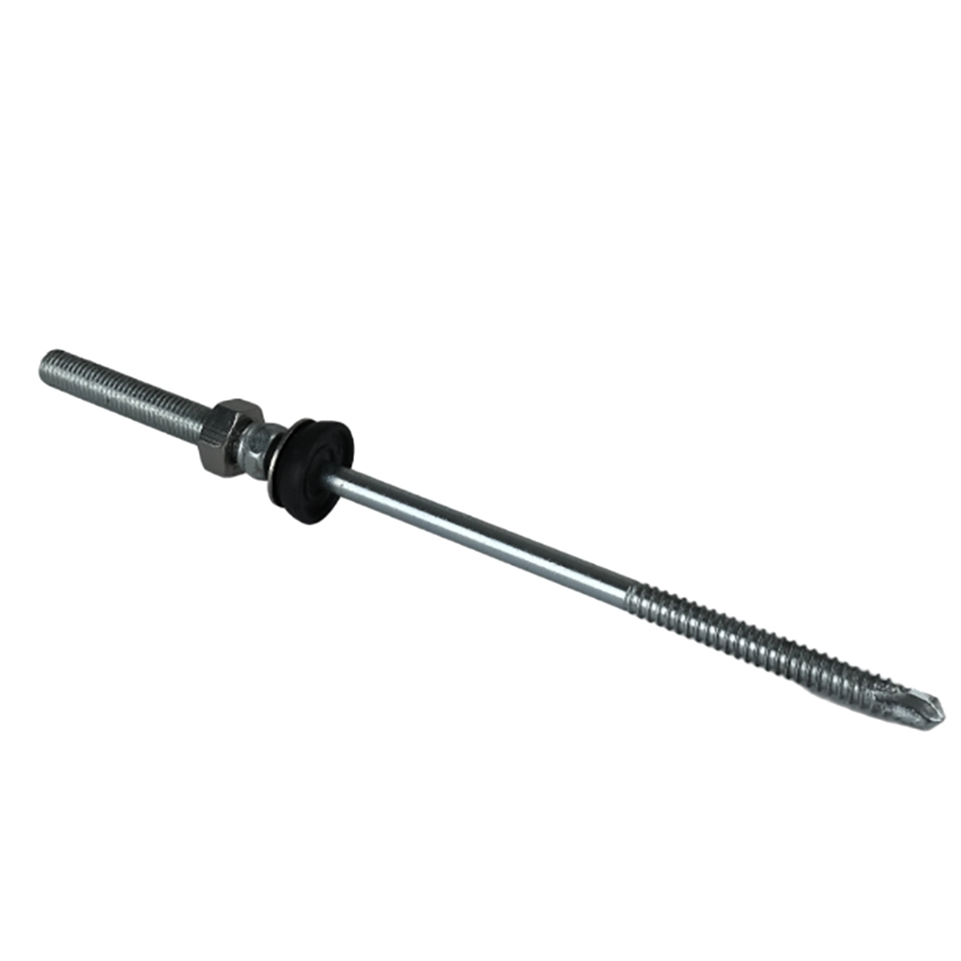 Stockschraube, ist eines von vielen Elementen, die für die Installation von Photovoltaikanlagen erforderlich sind. Das Produkt ist für die Montage auf Dachplatten, Blechen, Schindeln oder Teerpappe bestimmt. Ein charakteristisches Merkmal des Elements sind zwei unterschiedliche Gewinde an seinen beiden Enden. Das Ende mit dem Metallgewinde wird direkt in die Metalldachkonstruktion geschraubt, während die gegenüberliegende Seite als Befestigungspunkt für Adapter mit Flanschmuttern dient.