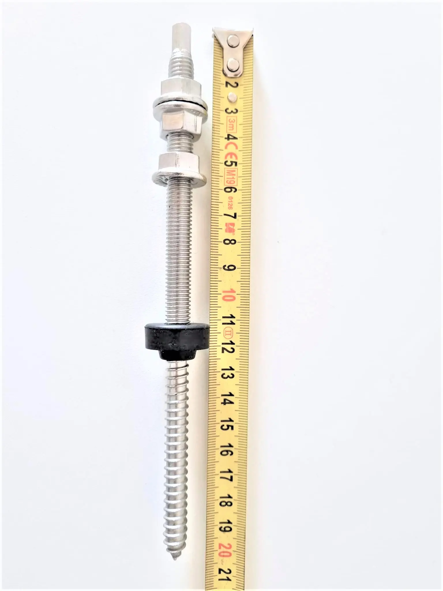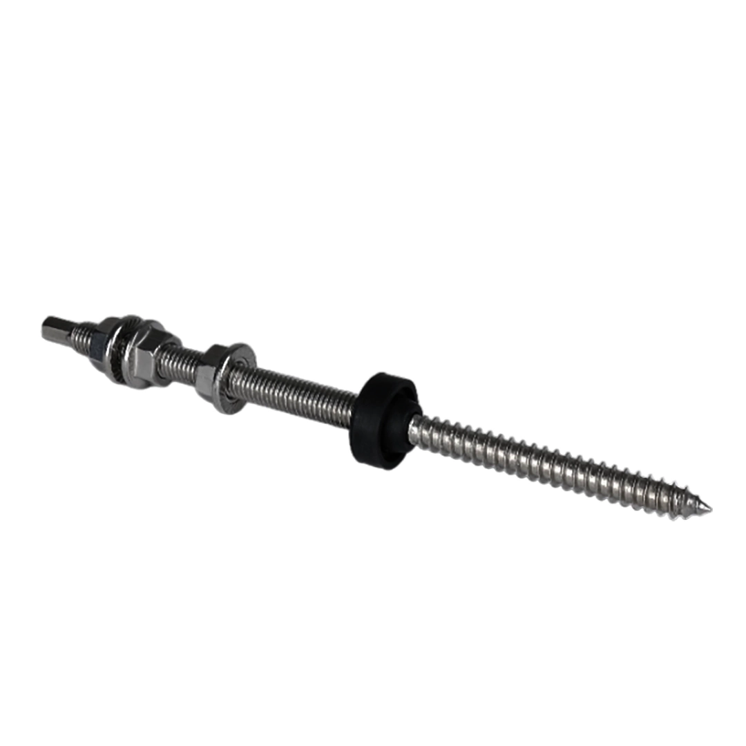 Stockschraube, eine der vielen Komponenten, die für die Montage von Photovoltaikanlagen erforderlich sind. Das Produkt wird auf Dächern, Blechen, Schindeln oder Filz montiert. Das Element zeichnet sich durch zwei unterschiedliche Litzen an jedem Ende aus. Das mit einem Gewinde versehene Ende wird direkt mit der hölzernen Dachkonstruktion verschraubt. Das andere Ende wird zur Befestigung von Adaptern mit Flanschmuttern verwendet.