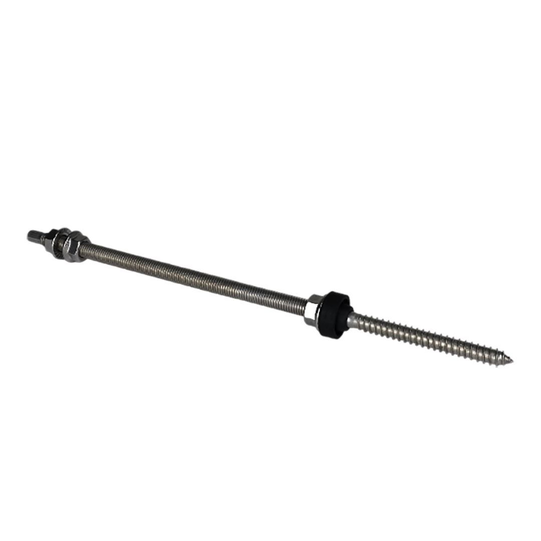 Stockschraube, eine der vielen Komponenten, die für die Montage von Photovoltaikanlagen erforderlich sind. Das Produkt wird auf Dächern, Blechen, Schindeln oder Filz montiert. Das Element zeichnet sich durch zwei unterschiedliche Litzen an jedem Ende aus. Das mit einem Gewinde versehene Ende wird direkt mit der hölzernen Dachkonstruktion verschraubt. Das andere Ende wird zur Befestigung von Adaptern mit Flanschmuttern verwendet.