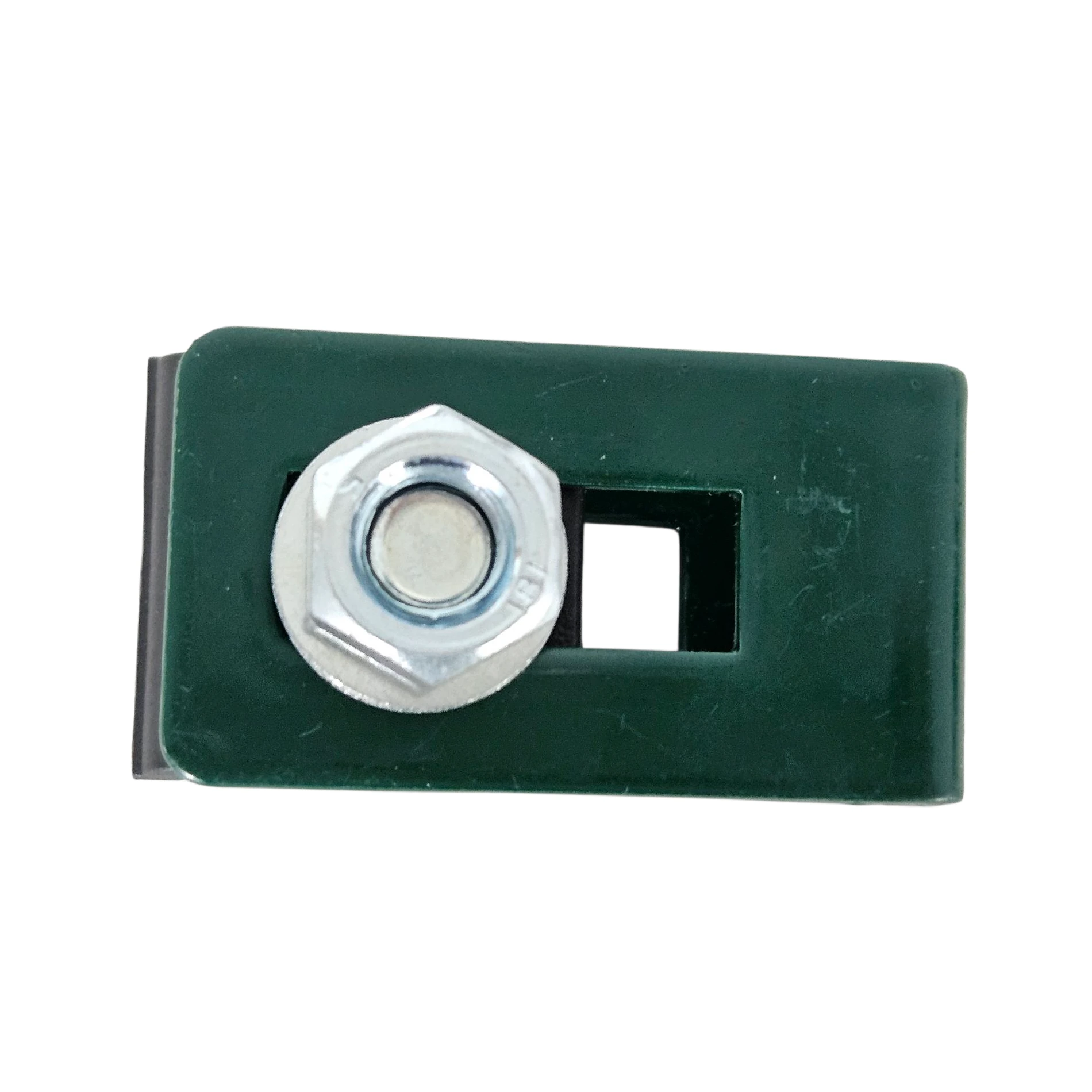 Hergestellt aus hochwertigem verzinktem Stahl, pulverbeschichtet in grüner Farbe, beständig gegen Witterungseinflüsse und mechanische Beschädigungen. Dank des bohnenförmigen Montagelochs ermöglicht sie eine Positionsregulierung.