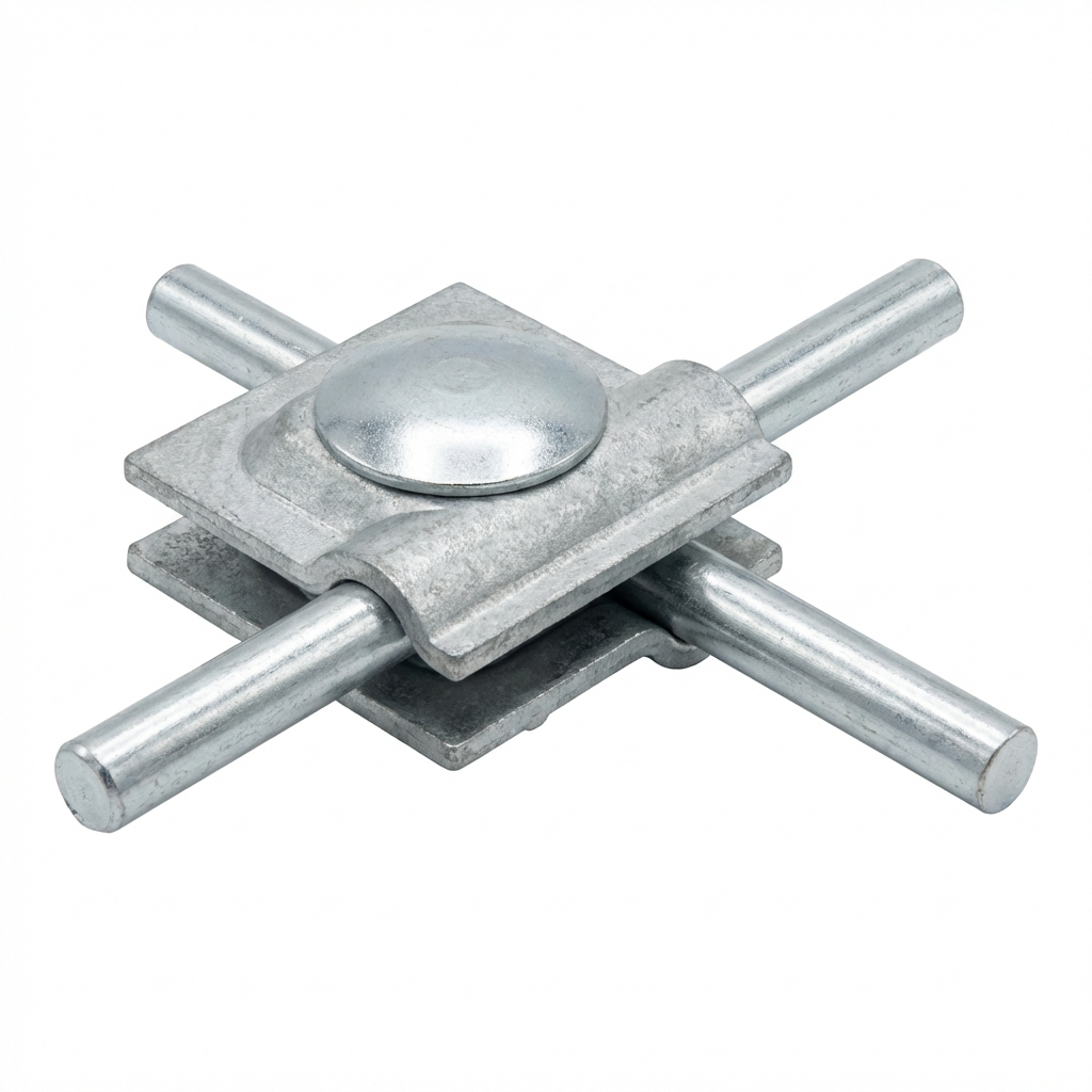 Der doppelte DIN-Universalverbinder dient zur Herstellung dauerhafter Verbindungen von Rundleitern in Blitzschutzanlagen. Es handelt sich um ein zuverlässiges Element des Blitzschutzsystems, das sich sowohl auf Dächern als auch in erdverlegten Installationen bewährt.