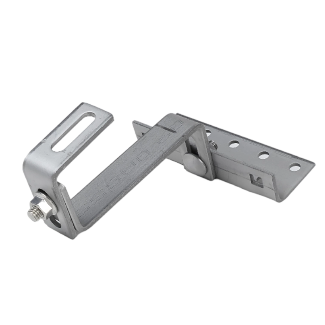 Ermöglicht die Verbindung von Profilen mit der Dacheindeckung. Der Vario-Haken wird mit einer Schraube am unteren Kanal der Schiene befestigt. Wird dort eingesetzt, wo Standard-Dachhaken (ohne Verstellung) zu kurz sind.