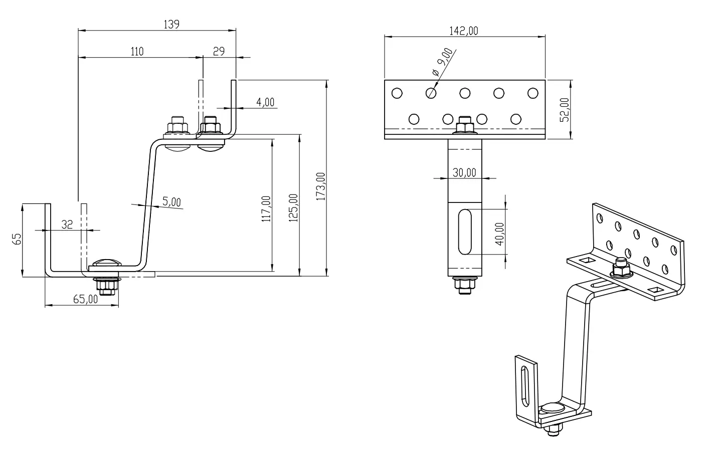 Ermöglicht die Verbindung von Profilen mit der Dacheindeckung. Die Vario-Konsole wird mittels Schraube am unteren Kanal der Schiene befestigt. Sie wird eingesetzt, wenn standardmäßige (nicht verstellbare) Dachhaken zu kurz sind.