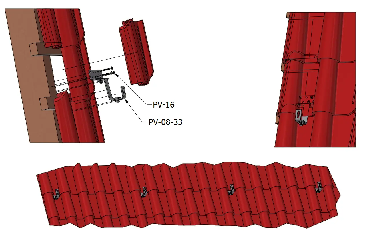 Vario Dachhaken zur Befestigung von Montageschienen für Photovoltaikmodule auf Dächern mit Keramik- und Betonziegeln. Garantiert die Stabilität der gesamten Konstruktion.