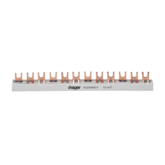Verbindungsbrücke 3-polig 57 Module 10mm², KDN363B gabelförmig von Hager, Schaltschienen werden verwendet, um Strom zu überbrücken oder Produkte miteinander zu verbinden. Die Auswahl des geeigneten Bustyps hängt von der Art des Geräts ab, da sich die physikalischen Parameter unterscheiden.