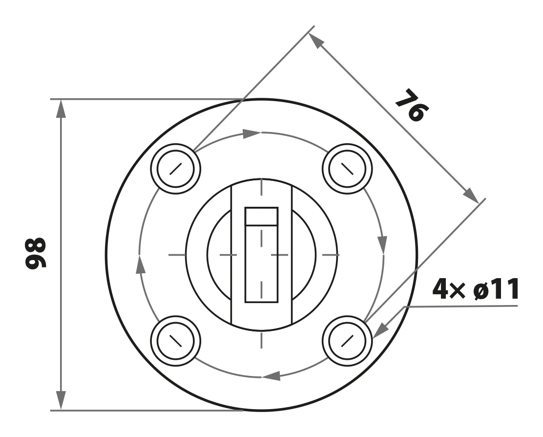 Die runde Montagebasis verfügt über 4 Montagebohrungen mit einem Durchmesser von ø11 mm, die auf einem Lochkreis mit einem Abstand von 76 mm angeordnet sind. Dies ermöglicht eine sichere und symmetrische Verschraubung mit dem Untergrund. Die im Lieferumfang enthaltene Abdeckrosette verdeckt die Schraubenköpfe und sorgt für ein elegantes, sauberes Erscheinungsbild.