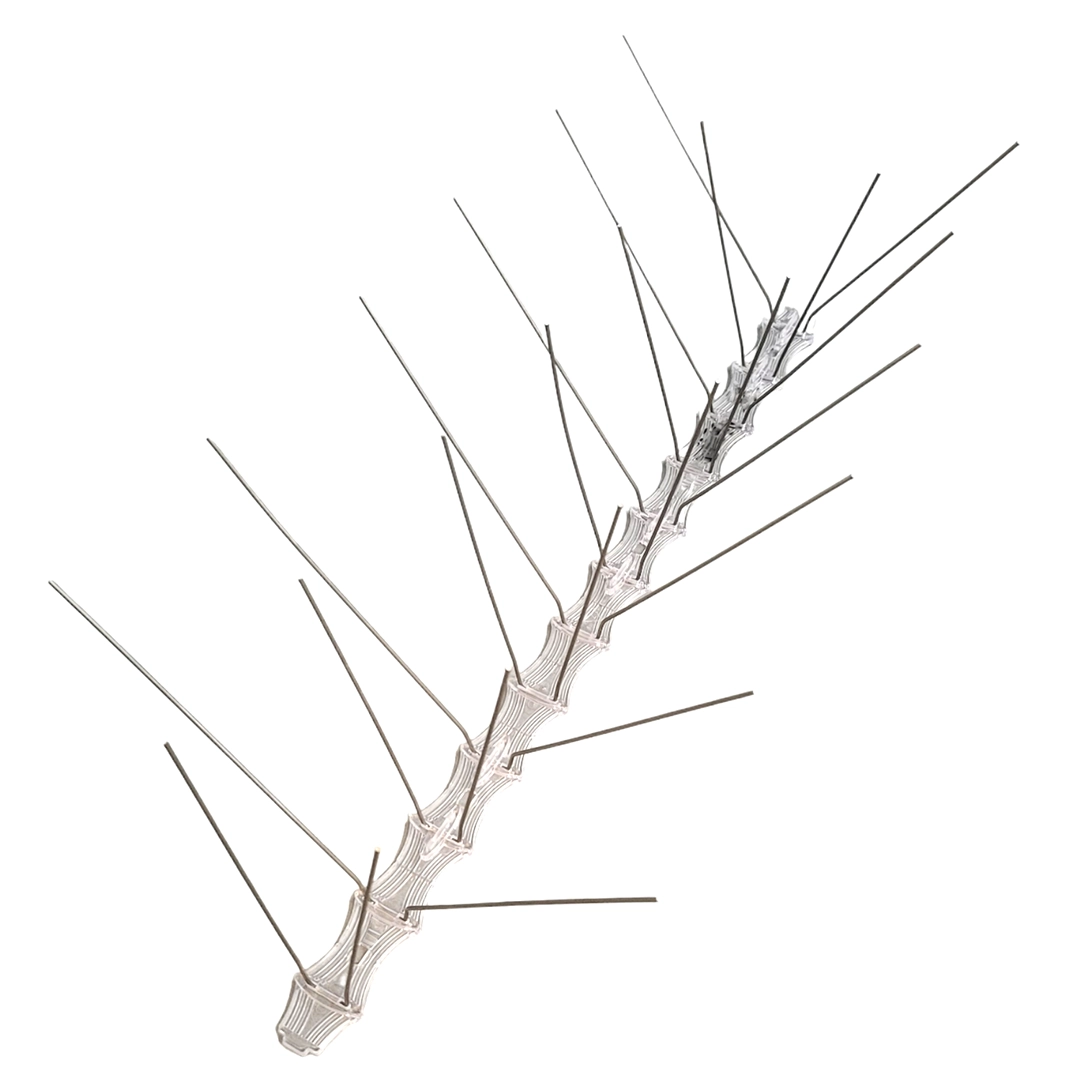 Die Stacheln haben eine Basis aus klarem, flexiblem Polycarbonat, das UV- und witterungsbeständig ist. Die Stäbe der Stacheln sind aus rostfreiem Stahl und ihre Enden sind abgestumpft, um Verletzungen der Vögel zu vermeiden.