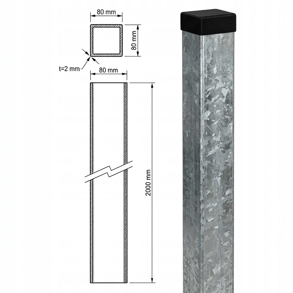 Zaunpfosten 80×80 mm mit einer Länge von 200 cm ist ein solides Konstruktionselement für den Bau von Paneelzäunen, Zaunfeldern, Toren sowie leichten Toren. Hergestellt aus Baustahl mit verzinkter Beschichtung Z140, bietet er hohe Korrosionsbeständigkeit und langjährige Haltbarkeit auch unter anspruchsvollen Witterungsbedingungen. Das ist eine fertige Lösung für Installationsunternehmen, die auf zuverlässige Materialien und schnelle Auftragsabwicklung setzen.