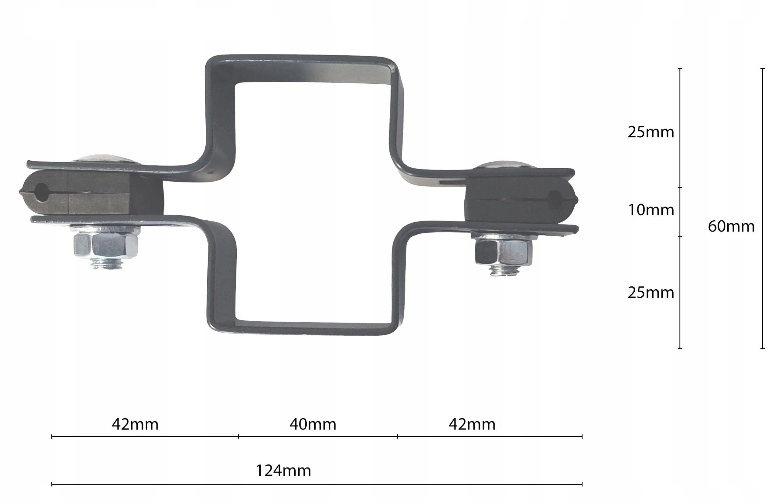 Die Zwischenklammer 40x60 mm ist ein zuverlässiges Konstruktionselement zur Montage von Zaunpaneelen an Pfosten mit einem Querschnitt von 40x60 mm.